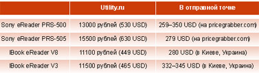 Вот вам тогда другой пример: устройства для чтения книг на основе технологии электронных чернил. Антонелло продемонстрировал мне полученные на тестирование украинские гаджеты lBook eReader V3 и V8. Гаджеты предоставила ему явно не розничная (если судить по адресу: ул. Складочная, 1, строение 5, офис 514) "Группа компаний Utility.ru". На сайте компании обнаружились и легендарные букридеры Sony. Однако цены! Цены! Это песня (см. табл.).