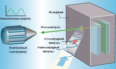 Чтобы достичь аттосекундного разрешения в эксперименте, ученые использовали мощный фемтосекундный импульс инфракрасного (750 нм) лазера. Импульс сфокусировали на трубочку с неоном, в котором в результате нелинейных процессов образовался короткий (около 100 аттосекунд) импульс вакуумного ультрафиолета с энергией фотонов около 90 электрон-вольт. Ослабив остатки инфракрасного излучения циркониевой фольгой, оба импульса сфокусировали на образец из вольфрама, причем время прихода инфракрасного импульса можно было менять, смещая зеркало. Выбитые из вольфрама электроны, после взаимодействия с полем инфракрасного импульса, которое слегка изменяло их энергию, попадали в спектрометр, измерявший энергию и время подлета электронов. После нескольких выстрелов с различной задержкой инфракрасного импульса электронные спектры уже содержали достаточно информации, чтобы точно определить время прилета электронов и выяснить, откуда был выбит тот или иной электрон - из зоны проводимости материала или из валентной зоны, из поверхностных состояний или из глубины материала, и как он там до импульса двигался.