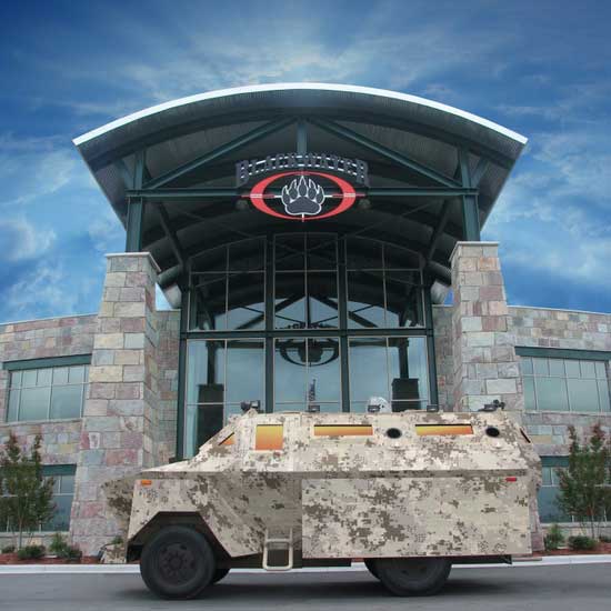 Вот 22-тонный броневик Grizzly производства Blackwater на фоне подъезда с эмблемой частной армии. Эту машину производит само охранное предприятие специально для боёв в городе.
