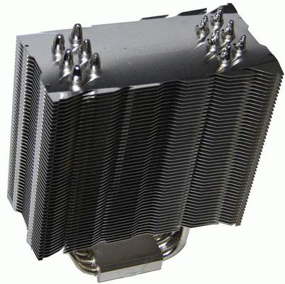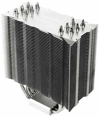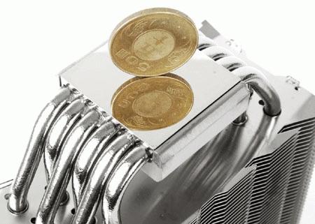 Перед нами по-прежнему вертикальная «башня» с шестью U-образными тепловыми трубками, пронизывающими алюминиевый пластинчатый радиатор в "шахматном порядке", никелированное медное основание. Трубки выстроены в ряд откровенно говоря, вашему покорному слуге такое построение не нравится, т. к. распределение по площади пластин очень неравномерное, получается, что трубки просто собраны в кучку.