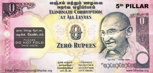В ответ на эту коррупционную напасть, давно уже разъедающую бюрократические инстанции, "5-я колонна" начала распространять банкноты рупий нулевого номинала в надежде, что обычные индийцы станут использовать эти купюры как средство протеста против откровенного вымогательства госчиновников.