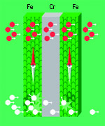 Рассмотрим два нанослоя магнитного материала железа, разделенные слоем немагнитного хрома [3]. Электрическое сопротивление в проводниках возникает в основном из-за того, что свободные электроны рассеиваются с прямого пути на атомах, отклонившихся со своего места из-за тепловых колебаний. В магнитных материалах электроны со спином, ориентированным вдоль направления намагниченности, рассеиваются заметно слабее, чем электроны с противоположно направленным спином. Поэтому после прохождения первого слоя в электрическом токе будут преобладать электроны с определенно направленным спином. Если следующий слой намагничен в ту же сторону, эти электроны и его пройдут почти без рассеяния, и электрическое сопротивление всего "бутерброда" будет мало [3a]. Но если второй слой намагничен в другую сторону, эти электроны в нем начнут активно рассеиваться, и полное электрическое сопротивление сильно возрастет, поскольку электроны с "правильным" спином уже почти все рассеялись в первом слое [3б].