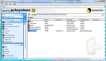 Срыл, вспомнил с тоской обо всех остальных ранее тестированных альтернативах, предвкушая повторение напрягов, да и рискнул попробовать хорошо известную, но в руки как-то не попадавшуюся Symantec PCAnywhere [2]. И попал в самое яблочко! Легкая, неприхотливая, интуитивно понятная, устанавливается за минуту, запускается без сбоев - еще через минуту. Вот вам пожалуйста - еще один кандидат на "поход в горы". Если вы в цейтноте, нет времени возиться со сложными настройками, учитываться мануалом, то PCAnywhere - однозначный выбор.
