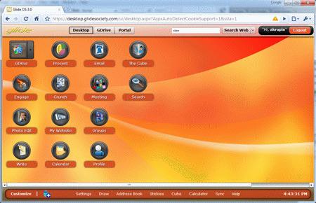 Рабочее окружение Glide OS поделено на три области Desktop, GDrive и Portal, для переключения между которыми предусмотрены соответствующие клавиши в верхней части окна браузера. На первом экране представлены ярлыки приложений почтового клиента, текстового и графического