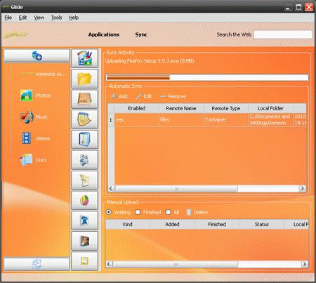 Вторая область рабочего стола GDrive оккупирована элементами управления хранящимися в недрах Glide OS файлами. Имея на руках халявные 30 Гб и толстый интернет-канал, можно забить систему всяким разным хламом, и чтобы в загружаемых на сервер данных было проще разбираться, создатели ОС заранее предусмотрели несколько тематических директорий Music, Videos, Photos, Documents и др. Пользователь может создавать свои папки (контейнеры в терминологии создателей ОС) и копировать в них файлы как самостоятельно через браузер, так и посредством специальной утилиты Glide One Sync, доступной для различных платформ и позволяющей выполнять автоматическую синхронизацию данных с онлайновой службой.