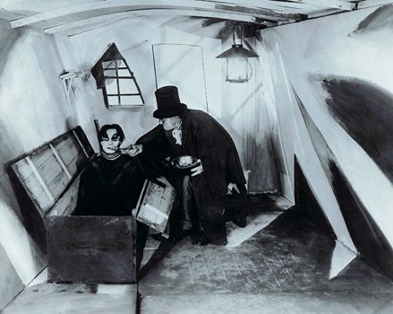 development of the movies in the mediums first two decades was directed toward the Lumière-style window on the world, with fictional or documentary stories presented in an emotionally stirring manner designed to make audiences forget they were watching a film, Caligari returns to the mode of Georges Méliès by constantly presenting stylized, magical, theatrical effects that exaggerate or caricature reality. In this film, officials perch on ridiculously high stools, shadows are painted on walls and faces, jagged cutout shapes predominate in all the sets, exteriors are obviously painted, and unrealistic backdrops and performances are stylized to the point of hysteria.