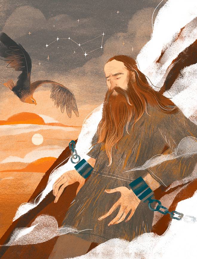 Наверное, самый известный культурный герой греческий Прометей, защищавший людей и похитивший для них огонь с горы Олимп. За такую дерзость боги наказали его. Прометея приковали цепями к скале (тут вспомним уже известного нам ногайского великана Топекоза), и каждый день к нему прилетал орел и клевал его печень. За ночь та снова вырастала, и кара повторялась. Конец мучениям положил Геракл, убивший орла и освободивший Прометея.