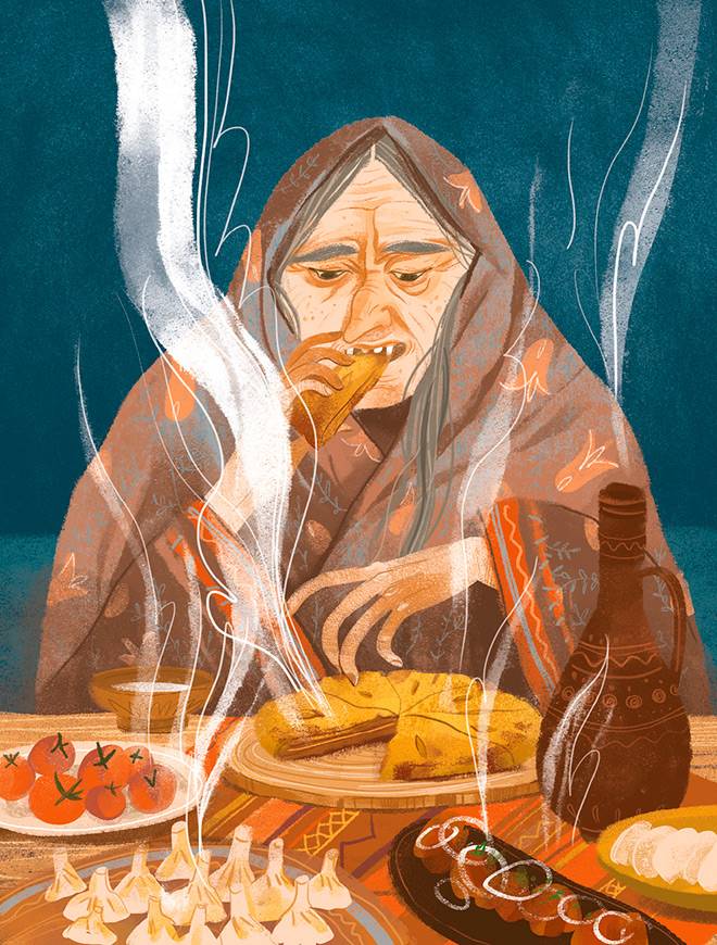 Это было в те давние времена, когда на земле жили сильные великаны нарты, созданные богом Тга. Бог-создатель не позаботился об их пропитании: себе он оставил стада баранов, а нарты питались травами да кореньями. Зимой, когда наступали холода, Тга прятал около себя солнце, чтобы оно его обогревало, а вот нартам почти не доставалось ни тепла, ни света. Смех Тга сотрясал горы и вызывал страшные обвалы. Вздохи его носились над землей ужасными ветрами, а слезы лились потоками дождя. Негде было нартам укрыться от непогоды: жили они в пещерах и спали на голых камнях, в то время как сам Тга обитал в хижине из тростника и почивал на мягких пышных облаках.