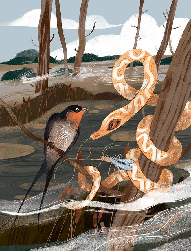 В давние времена все животные говорили на общем языке и понимали друг друга. Любили тогда поболтать змея, комариха и ласточка, жившие на одном болоте.