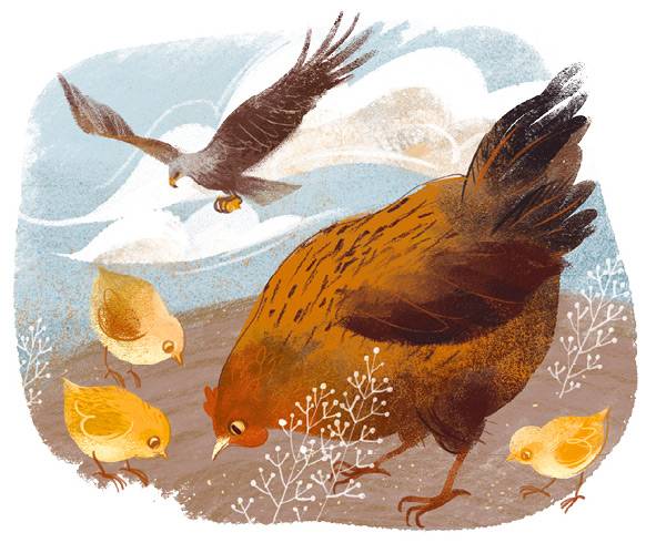 Так и повелось с тех пор: курица с цыплятами внимательно осматривают и роют землю, продолжая искать пропажу, а коршун все ворует цыплят.