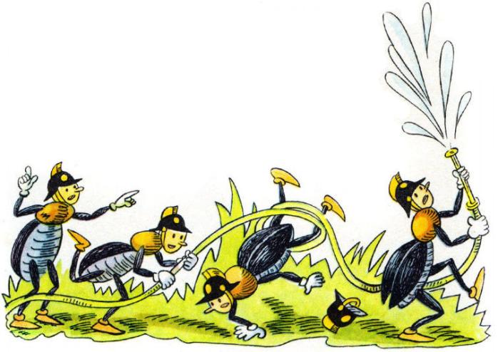 подумали, що то вогонь! Коли б вони почекали, Ферда їм міг би пояснити, що в усіх чорних джмелів на спині є така жовтогаряча пляма, яка наче горить. Але тріскунці вже поливали з шлангів так, що й мертвого збудили б.
