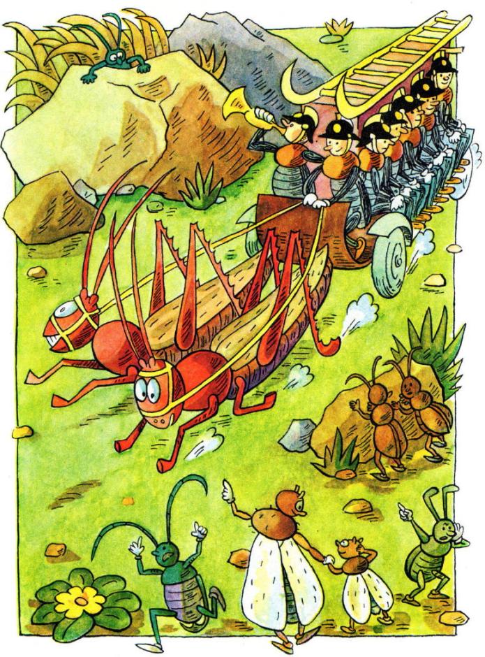 З лісу вихопився віз пожежників, запряжений червоними кониками, а на возі сиділи жучки-тріскунці з пожежницькими шоломами на головах, і просто до Джмеля.