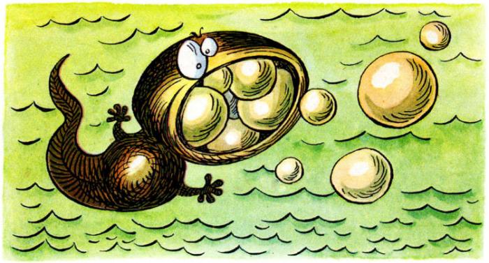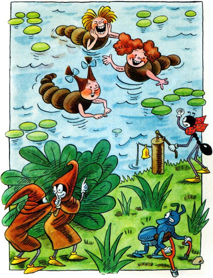 Ой, як швидко всі личинки ховались тоді у воду! Боялися, щоб їх не поїли гусенята. А потім сердились, коли бачили, що Ферда їх обдурив, і кричали йому:
