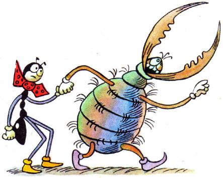 Та почекайте, може, ще трапиться щось таке, чого ніхто не чекав. Ось подивіться! Сюди йдуть якісь два дивні жуки. Ось вони вже біля Ферди й уже вітаються з ним. Хто ж це може бути? Обидва вдягнені в такі довгі ряси, а на голові в них маленькі шапочки з довгими вусами.