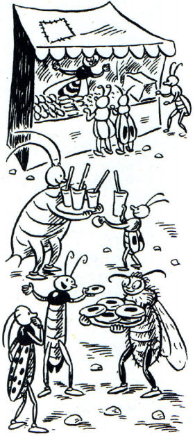 Повсюди грали комашині оркестри. Тлі продавали солодке свіже питво. Бджоли носили медові пундики, а оси ті відкрили цілу ятку із солодощами. Там був турецький мед, локриця, марципани, карамельки й таке інше все, що оси вчора поцупили й принесли від людей. Ото коло них була штовханина!
