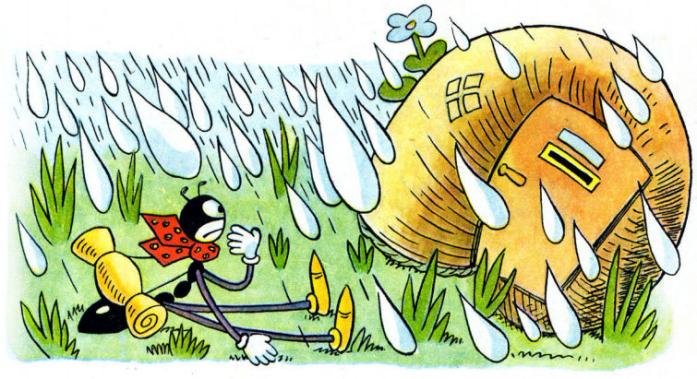 «Чудово, подумав Ферда. Сховаюсь у цій хатині. Пан господар, напевне, мене пустить». І він легесенько, одним пальчиком, постукав у двері, та ніхто не відчинив. Муравлик спробував постукати двома пальчиками, але й на цей раз ніхто не озвався. Тоді він постукав усією долонею й попросив: «Чоловіче добрий, відчиніть, бо тут січе дощ!» але знову марно!