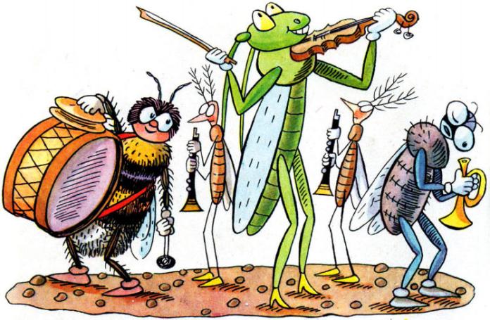Цвіркун, як відомо, мастак на витівки. Він став попереду зі скрипкою, за ним двоє комарів з кларнетами, потім гедзь з трубою і джміль з барабаном. Всі разом вони як гримнули: «Бум, бум, бум, тра-дра-та, тра-дра-та, трам-тара-та, ра-та-та», аж луна покотилася навколишньою лукою.