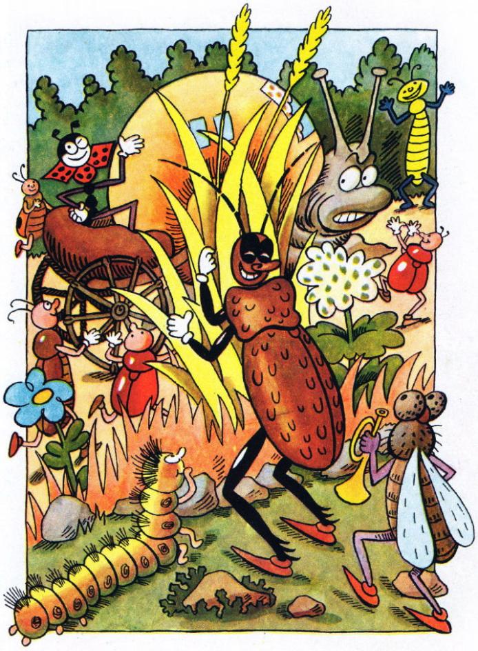 Звідусіль почали збігатися комахи. Прибігли маленькі жучки, сонечка, з трави визирнув коник, а з межі примчав у своїх чоботях-скороходах жук-стрибунець. Од реготу аж лящало навкруги.