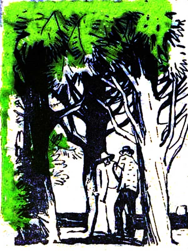 На краю обрыва Ильмар остановился. Смешно подпрыгивая, турист стремительно уходил с уверенностью человека, знавшего здешние места. Ильмар переждал, пока тот скроется в чаще, и, приметив ориентиры, спустился следом.Он остановился, услышав впереди себя голоса. Говорили о каком-то багаже из Новороссийска. Мальчик разглядел сквозь листву старика с длинными обвислыми усами. Он опирался на здоровенную трость, перекладывая её из руки, в руку. Турист стоял к Ильмару спиной.