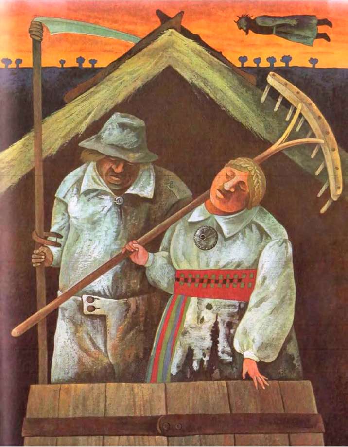 Хозяин начал было спускаться по лестнице, но чья-то рука вдруг схватила его за горло, и скопидом упал замертво. Жена его потом нашла на сеновале лишь три капельки крови. Проходя мимо амбара, она заметила, что закрома пусты, а ларь вместо денег был набит жухлыми березовыми листьями.