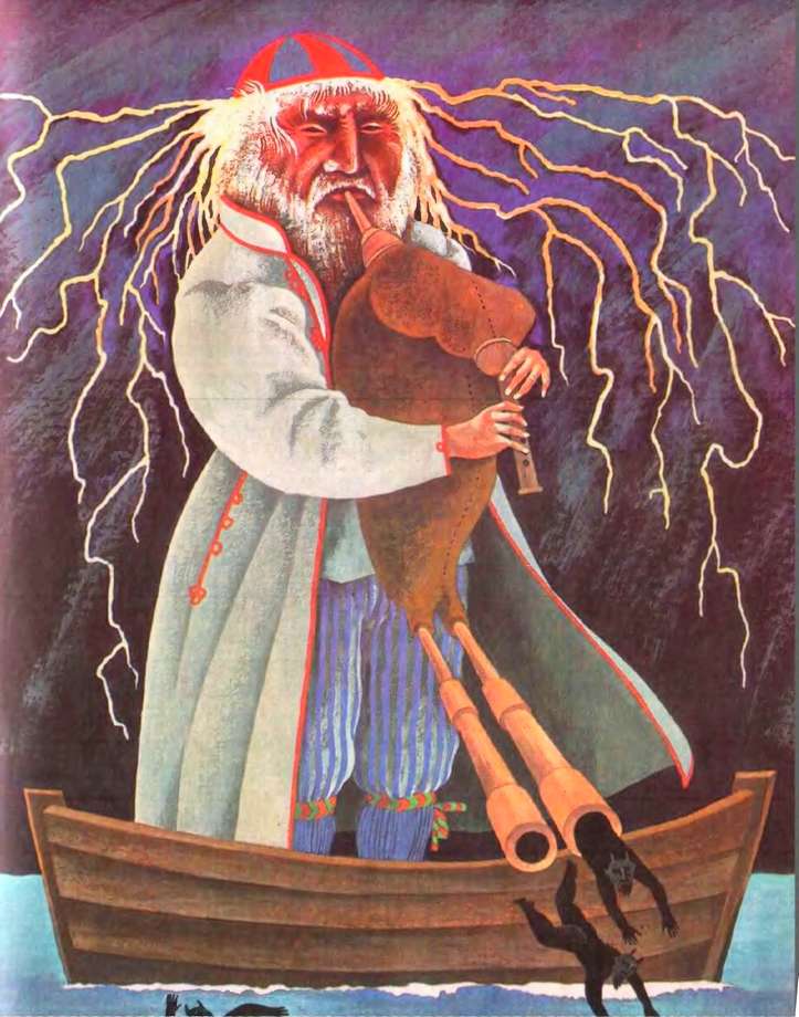 Нечистый, который никакого подвоха не заметил, отдал волынку мальчонке. Ну и чудеса! Стоит вместо мальчонки сам старик Громовержец и так дует в волынку, что черт со всем своим семейством повалились на пол.