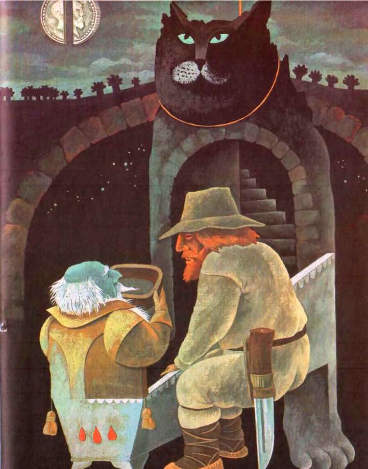 Посреди огромного со сводчатым потолком подземелья громоздилась куча золотых и серебряных монет, похожая на большой стог сена. Старичок достал из стенного шкафа связку восковых свечей, три бутылки вина, копченый окорок, краюху хлеба и сказал: