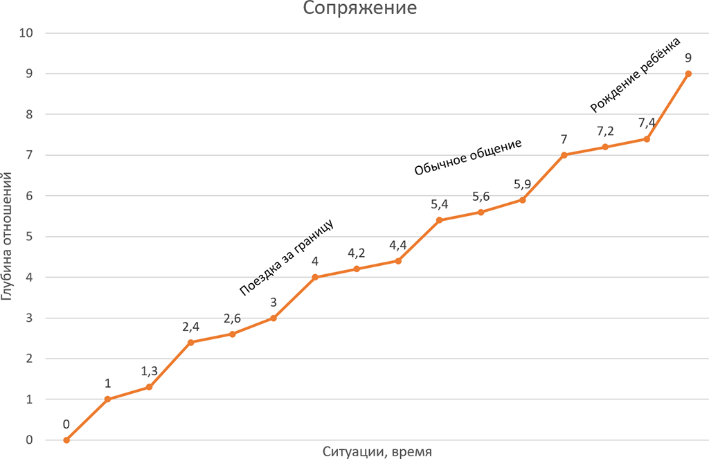 Итак, что же такое «глубина в отношениях». Это есть не что иное, как схожесть интеллектуальных объектов, их можно назвать «совместно нажитыми», они так же, как и доверие, формируются со временем взаимодействия. К примеру, съездили вы вместе с девушкой за границу, у вас сформировался интеллектуальный объект, конечно, они отличаются друг от друга, но всё же гораздо более схожи, чем «не совместно нажитые». С коллегой провели приятно время, с партнёром по бизнесу сделали общий проект и так далее. Всё это есть совместно нажитые объекты, которую уменьшают вашу разницу в объектах, а следовательно, и десинхронизацию, это первое. Второе это, конечно, знания о своём объекте отношений, т. е. его отношение к тому или иному, взгляды, представления, потребности, цели, знание в области его знаний и т. д., иначе говоря, представления о его интеллектуальных объектах, которыми он оперирует под некоторыми потребностями. Этот процесс можно назвать сопряжением, тогда получается, что глубина отношений это некоторая величина, определяющая вашу сопряжённость.
