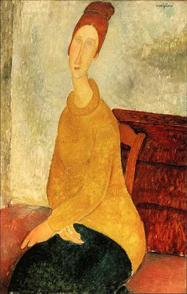 Весной 1918 творец вместе с супругами Зборовски, своим другом Хаимом Сутиным и Жанной покинул французскую столицу из-за опасности бомбардировок и уехал на юг, в Ниццу. Там палитра художника заметно посветлела, линии стали тоньше, а цветовые плоскости более разнообразными. 29 ноября Эбютерн родила дочь, которую тоже назвали Жанной. Вероятно, на этом полотне избранница мастера изображена после родов, ее образ тонок и лиричен. Молодая женщина с бледной кожей и рыжеватыми волосами кажется будто оторванной от реальности. «Она была мягкой, кроткой, молчаливой и нежной. Немного депрессивной» так говорил о спутнице художника писатель Шарль Альбер Кингрия. После рождения ребенка Модильяни обещал сочетаться браком с Жанной, даже существует письменное свидетельство от 7 июля 1918, в котором говорится, что он женится на своей невесте, «как только будут готовы документы». Однако выполнить обещание живописцу не хватило времени. На надгробии кладбища Пэр-Лашез высечено: «Амедео Модильяни, художник Умер в Париже 24 января 1920. Смерть настигла его на пороге славы», а чуть ниже на той же доске: «Жанна Эбютерн Умерла в Париже 25 января 1920. Верная спутница Амедео Модильяни, не захотевшая пережить разлуку с ним».