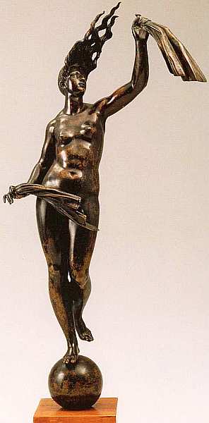 успехом, как и всяческими несчастьями, она наделяет непредсказуемо. Поэтому автор традиционно ставит обнаженную Фортуну на шар (державу), являющийся ее атрибутом при изображении. Скульптор отказался воплощать богиню с завязанными глазами, она резким, победным движением, похожим на прощальный жест, сдернула полоску ткани, в мастерском балансе довлея над миром, держа ее как победный стяг.