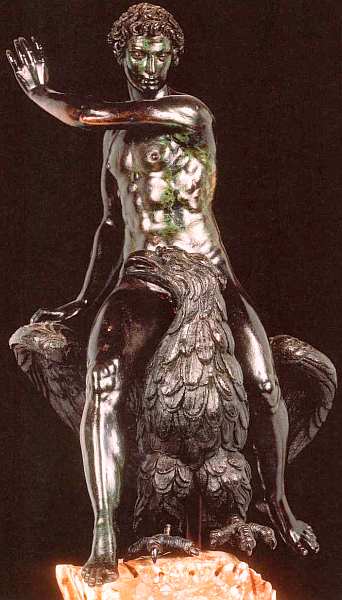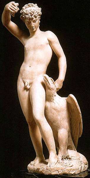 Ганимед, сын царя Трои Траса, как и его собрат из другой эпохи, царевич Парис, сын Приама и возлюбленный Елены Прекрасной, являлся пастухом. Овидий повествует в своих «Метаморфозах», что верховный бог Юпитер был покорен красотой Ганимеда и в облике орла вознес его на Олимп. Там молодой человек сделался виночерпием на пиршествах богов. Ренессансный гуманизм толковал тему Ганимеда как вознесение человеческой души к Богу, однако вряд ли эта мысль занимала скульптора.