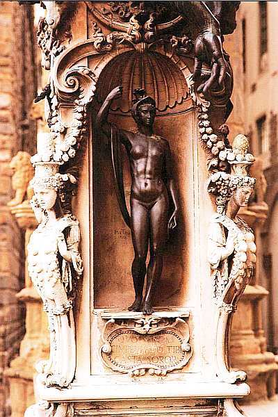 Как и «Минерву», своего «Меркурия» Бенвенуто Челлини поместил в одну из ниш цоколя статуи «Персей с головой Медузы». Ужасные чудовища горгоны, обитавшие на краю земли, там, где царили боги Нюкта (Ночь) и Танатос (Смерть), считались непобедимыми. Убить их было возможно лишь изогнутым мечом бога Гермеса (в римской мифологии Меркурия), вестника и проводника богов. Это чудесное оружие, способное рассечь твердые как сталь перья монстров, владелец сам отдал герою Персею и проводил его до места будущего подвига.