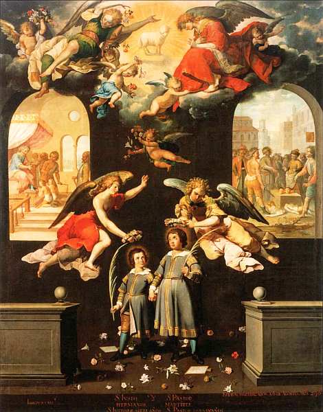 В восьми медальонах изображены отцы церкви и святые, особо значимые для Общества Иисуса. Среди них прославившийся искренностью любви к Богу и самоотверженной помощью больным святой Луиджи Гонзага, с лилией, распятием и черепом (кисти Руиса, среди прочих известных работ, принадлежит его отдельный портрет). В черной рясе с традиционным атрибутом книгой, в которой начертано: «Ad najorem Dei gloriam» («Для вящей славы Божией»), представлен Игнатий Лойола. В нижней части картины изображена скорбящая Мария, рядом с ней святой Иоанн и Мария Магдалина. Венчает композицию фигура Бога Отца. Созданные живописцем образы отличает экзальтация, характерная для художественного языка стиля барокко.