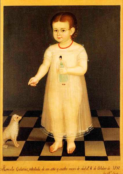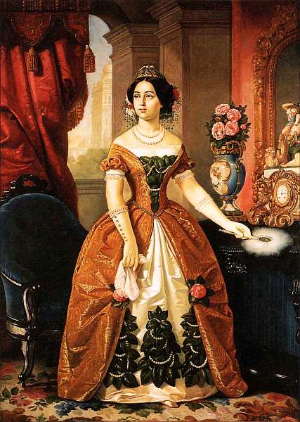 Хуан Кордеро, изучавший принципы академической живописи в Риме, известен как автор ряда станковых и монументальных работ, композиций на исторические и бытовые сюжеты, а также портретов. К числу наиболее известных его картин принадлежат парадные изображения генерала Антонио Лопеса де Санта-Анна, занимавшего пост президента Мексики в общей сложности одиннадцать раз, и его второй супруги Долорес Тоста де Санта-Анна. Художник представляет молодую красавицу в роскошной обстановке интерьера Национального дворца (официальной резиденции президента), готовой к торжественному приему или выходу в свет. Ее платье и прическа декорированы нитями жемчуга, цветами и листвой, в руках женщина держит кружевной платок и пуховый веер. Драгоценную диадему украшает изображение орла, входившее в государственную символику.
