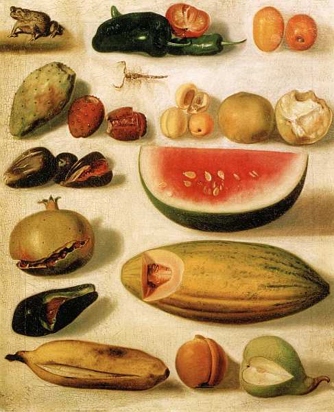 К числу редких картин Бустоса на холсте принадлежит натюрморт из собрания музея. Словно в книге по естественной истории, на светлом фоне рядами расположены овощи и фрукты разной степени зрелости. Некоторые из них надрезаны или надломлены таким образом, чтобы были видны мякоть и семена. Среди плодов нашли себе место и живые существа скорпион и лягушка. Работу отличает стремление художника к реалистической, максимально точной передаче фактуры изображенного, световых бликов на гладкой кожуре, разнообразных цветовых оттенков. Своеобразной парой к данному произведению является «Натюрморт с ананасом» (1877), также написанный на холсте.