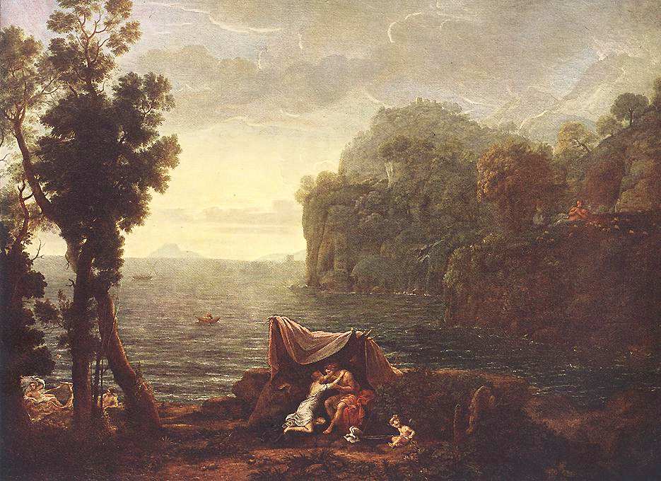 Лоррен изобразил несколько моментов этой истории: Галатея приплывает к берегу на своей ладье, ее парус атрибут римского духа Воздуха;
