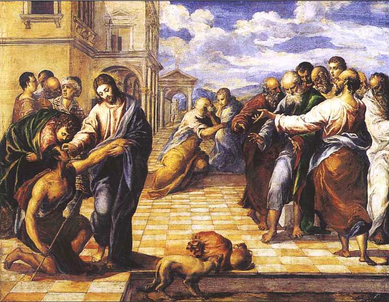 Произведения на сюжет исцеления слепого Эль Греко писал, по крайней мере, три раза. Все картины имеют схожую композицию, но различаются в трактовке деталей. Дрезденская самая ранняя и включает в себя жанровую сцену с собакой, чего нет в других версиях.