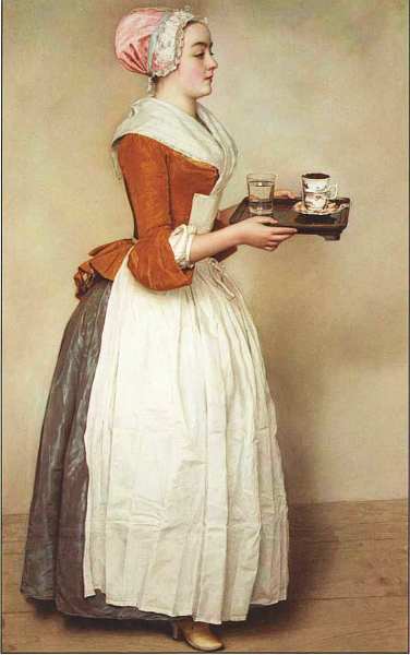 Конечно, такой статус произведения основан на его исключительных художественных достоинствах. Оно не столько поражает, сколько пленяет. Таково, кстати, истинное предназначение стиля рококо. В ней все необычайно гармонично: общий рисунок (формы и пропорции фигуры), цветовая гамма серая серебристая юбка и белый фартук, столь детально и любовно написанный с сохранением мельчайших складок, розовый чепчик с белой кружевной отделкой, чудесно выписанный стакан с водой и бликами на ней, наконец чашка с шоколадом образец тончайшего мейсенского фарфора. Известно имя модели это юная красавица Анна Бальдауф, горничная при дворе австрийской императрицы Марии Терезии.