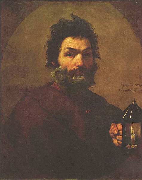 Дрезденская картина представляет собой изображение древнегреческого философа-киника Диогена Синопского (IV век до н. э.). Другой Диоген Лаэртский оставил его жизнеописание, из которого художники черпали анекдоты об аскете. Один из эпизодов: великий Диоген днем на рыночной площади с лампой в руке (!) ищет человека. Нередко в XVII веке упомянутый сюжет изображался не в действии, а, как у Риберы, в виде портрета: философ держит лампу символ поиска истины и добродетели.