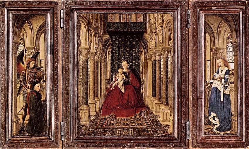Большое значение имеет текст, данный на триптихе. Это цитаты из Библии и другие латинские сентенции. Младенец держит послание с текстом, так называемую бандероль: «Научитесь от Меня, ибо Я кроток и смирен сердцем». На оригинальных рамах всех частей картины сделаны надписи, на нижней планке центральной панели на латыни написано: «Иоханнес де Эйк выполнил и завершил в лето Господне 1437. Как я сумел». Эти слова оказались доступны для прочтения лишь в 1958, спустя почти 520 лет после создания триптиха! До этого времени считалось, что произведение принадлежит более раннему периоду творчества мастера.