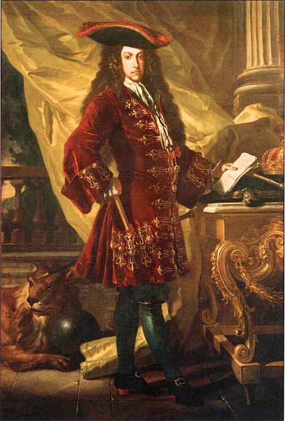 Эта картина парадный портрет короля Испании. Правитель изображен в традиционных декорациях: богатая портьера золотого цвета, монументальная колонна, аллегорическая фигура льва, попирающего сферу. Свет играет такую же символическую