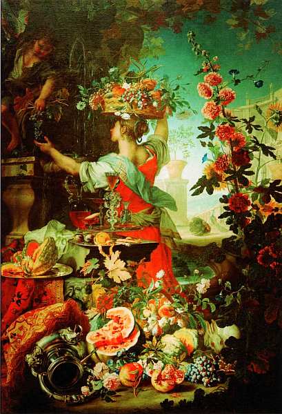 Натюрморт, как это было принято в классическом европейском искусстве, несет в себе символический смысл аллегорию плодородия. Фрукты написаны очень точно, реалистически, они будят воображение и аппетит, а окружающая среда, небо, напротив, будто условны, вневременны. Все указывает на то, что девушка, фрукты, а вместе с ними и зритель оказываются в загадочном, волшебном, заповедном краю. Юной героине виноград подает еще один излюбленный итальянскими художниками начиная с эпохи Возрождения персонаж Амур, маленький ангелок. На этой картине он явно олицетворяет пантеистическую любовь и чувственность, разлитые в плодах природы.