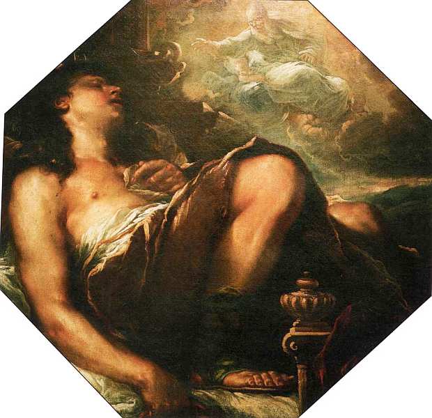 Выбранное в этой картине решение удивляет, ведь, по преданию, Алексий был аскетом, странником, «божьим человеком». Здесь Джордано отказывается от традиционной трактовки святого, изображает его юношей, который, кажется, спит. Художник создает фигуру, напоминающую образы Микеланджело: такое же чувственное тело, такой же смелый ракурс и пропорции атланта. Алексий, как и герои великого мастера, одновременно представляет античный идеал и идею христианского духовного титанизма. Живописная фактура, стремительность работы кисти, сдержанная, благородная гамма все это создает очень целостное изображение и вызывает восхищение.