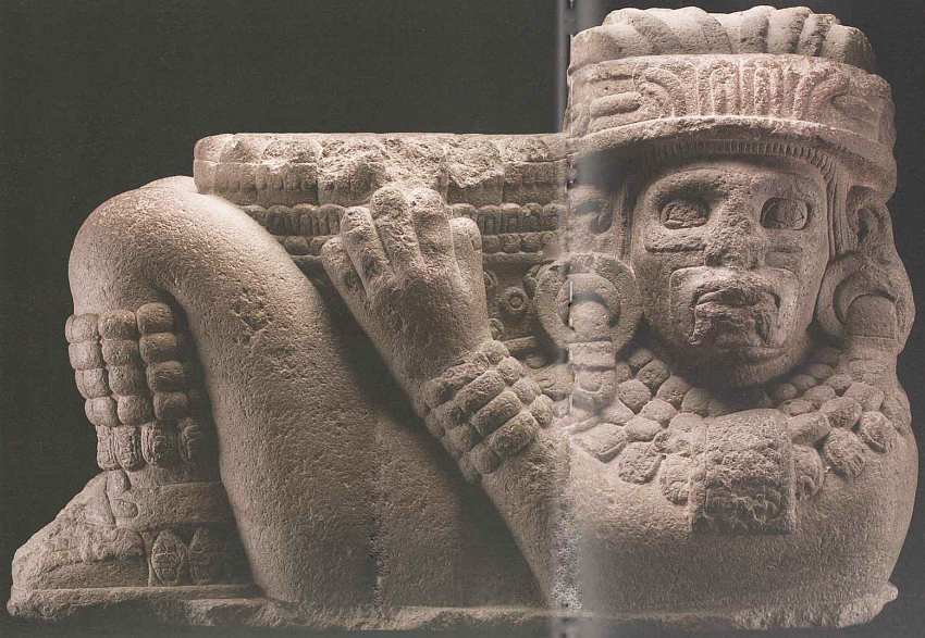 Открытая в 1943 статуя Чак-Моола отмечена рядом изобразительных знаков, свидетельствующих о непосредственной связи изображения с божеством покровителем вод. Так, на невидимой зрителю нижней поверхности плиты вырезан образ бога Тлальтекутли в окружении водных символов, дно сосуда-куаушикалли украшает лик Тлалока, наконец, лицо самой фигуры воспроизводит черты, традиционные для маски бога глаза обведены широкими кругами, изо рта выступают длинные клыки. Очевидна связь этого памятника с храмом Тлалока, поблизости от которого он и был найден. Фигура украшена многочисленными элементами роскошное рельефное ожерелье, широкие браслеты, массивные круглые серьги-вставки, головной убор из длинных перьев. В декоре сандалий использованы изображения ритуальных ножей из кремня со стилизованными антропоморфными «лицами» глазами и зубами.