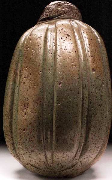 Тыквенные культуры начали выращивать на территории Мексики приблизительно семь тысяч лет назад, отсюда испанцами они были завезены на территорию Европы. Особые сорта культивировались для получения широко применявшихся в хозяйстве сосудов. Сохранилось множество сделанных в форме тыквы сосудов, а также созданных в камне ее изображений. Данное выполнено с большой точностью показаны продольные бороздки на кожуре, утолщение у основания плода. Поверхность изделия тщательно отполирована.