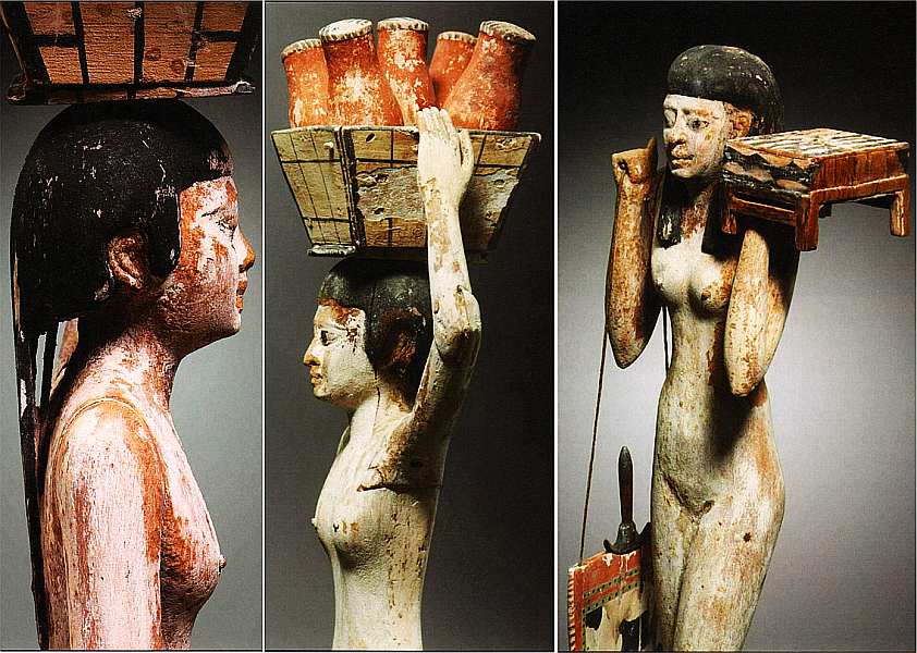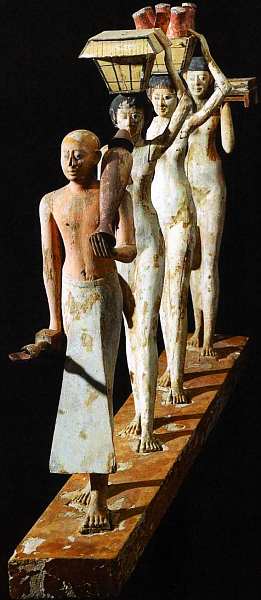 Данная древнеегипетская скульптурная композиция один из лучших образцов собрания, она относится к эпохе Среднего царства. Ее предметы поражают мастерством и тонкостью работы. Здесь показаны мужчина и три женщины, несущие жертвоприношения умершему в его загробную жизнь. Каждая фигура изображена в позе с выставленной вперед левой ногой. Естественно предположить, что это отражение в миниатюре традиционного богослужебного погребального обряда, когда священник идет впереди, неся церемониальный сосуд вина и курильницу. За ним следуют две женщины с яствами и питьем, третья несет предметы, выражаясь современным языком, личной гигиены. Все это необходимо в реальной жизни, а также, как полагали древние египтяне, и в загробном мире.