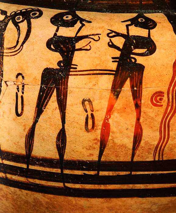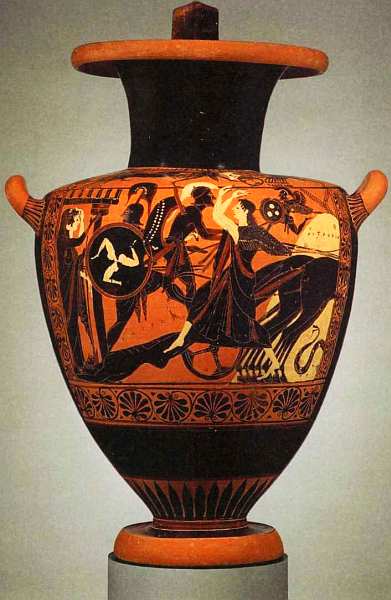 Гидрии испокон веков украшались росписями. Естественно, выбор тем для них определялся назначением предмета. В данном случае сюжет, связанный со смертью, взят из истории Троянской войны. Предыстория эпизода: Зевс поднимает весы, на которых лежат два жребия Гекторов и Ахиллов. Чаша Ахилла взлетела ввысь, Гектора наклонилась к подземному царству. И Громовержец дает знак: Аполлону покинуть Гектора, Афине прийти на помощь Ахиллу. Она удерживает Гектора, и тот сходится с Ахиллом лицом к лицу. «Обещаю, Ахилл, говорит Гектор, если я тебя убью, то сниму с тебя доспехи, а тела не трону; обещай мне то же и ты!» «Нет места обещаниям: за Патрокла я сам растерзаю тебя и напьюсь твоей крови!» кричит Ахилл. Копье Гектора ударяет в Гефестов щит, а копье Ахилла пронзает горло противника, и он падает со словами: «Бойся мести богов: и ты ведь падешь вслед за мною!» «Знаю, но прежде ты!» отвечает Ахилл.