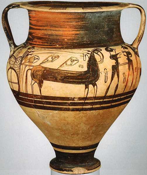 Кратеры представляют собой большие емкости с широким устьем, наподобие котлов, и двумя ручками по бокам. Как и другие древнегреческие сосуды, они и данный, происходящий с Кипра, в частности, украшались живописью. Он сделан из глины и раскрашен черной и коричневой краской. Тема росписи спортивный турнир. На противоположных сторонах изображены две колесницы, управляемые наездниками. Здесь же две мужские фигуры соревнуются в борьбе на поясах (разновидность состязания по перетягиванию каната). Этот вид спорта можно найти запечатленным на памятниках, найденных на островах Эгейского моря. Он описывается так: два противника связывают себя поясами на талии. Они стараются лишить друг друга равновесия и перетянуть каждый на свою сторону. Положение их ног говорит о большом напряжении сил, руки атлетов согнуты в боксерских жестах.