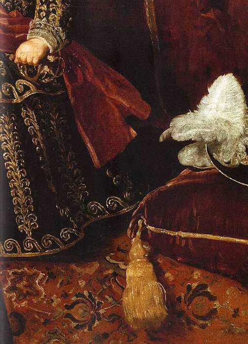 Данная картина представляет маленького белокурого мальчика, по-взрослому облаченного в великолепно вышитые церемониальные королевские одежды. В руках у него жезл и кинжал атрибуты власти и символы будущей роли военачальника. Его лицо, очаровательное, как у матери-француженки на ее детских портретах, обращено к другому ребенку, изображенному на переднем плане слева, ненормально большая голова которого повернута к принцу. Это карлик, сейчас считается, что девочка. При августейших особах держали таких калек в качестве живых игрушек (традиция европейских дворов того времени). В шутовском подражании принцу героиня держит серебряную погремушку и яблоко, будто скипетр и державу, и ведет себя, как потешный мажордом будущего, а пока еще маленького короля. В настоящее время можно только гадать, как отнеслись августейшие родители принца к идее картины.
