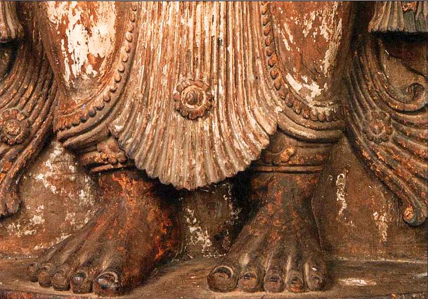 Перед троном размещена композиция, изображающая колеса закона (дхармачакру) между двумя лежащими оленями, что сопоставляется с историей первой проповеди Будды в Оленьем парке. Алтарь венчает полусфера, означающая купол неба, на ее вершине сосуд, являющийся одним из наиболее популярных индуистских символов изобилия и богатства (пурна-гхата). В основании алтаря фигуры поклоняющихся мужчины и женщины.