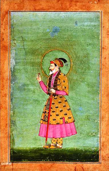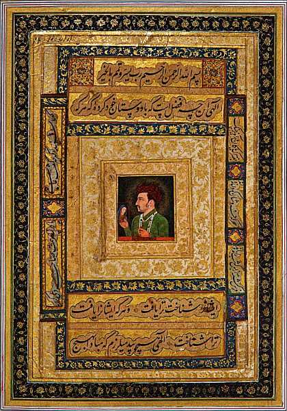 Джахангир был большим поклонником портретного жанра, данная работа демонстрирует это увлечение императора. Перед зрителем его прижизненный портрет, свидетельствующий об интересе властителя к христианству. Джахангир представлен в профиль согласно канонам изображения царей. В руках он держит европейскую картину с Девой Марией. Голову властителя окружает нимб, указывающий на божественный характер его персоны. Портрет заключен в богато оформленную золотым орнаментом массивную рамку-поле. Надписи из Корана, помещенные в нее, уравновешивают христианский характер миниатюры. Они выполнены почерком насталик известным каллиграфом Ходжой Абдуллой Ансари.